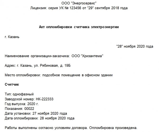- Данные о компании, которая заказала опломбировку прибора: название, адрес, иные сведения.