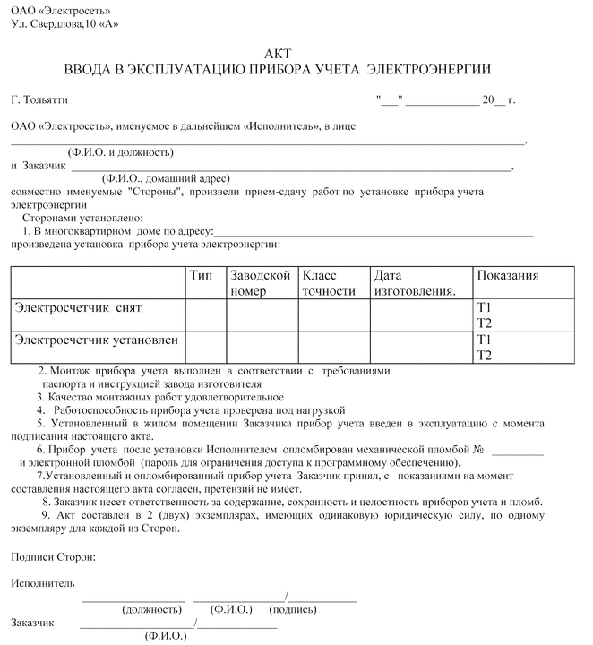 Акт замены счетчика электроэнергии состоит из восьми пунктов: