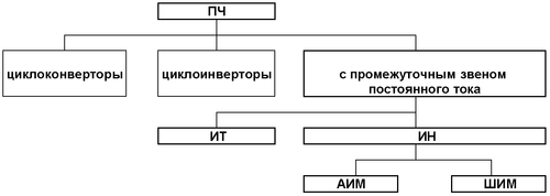 ПЧ — преобразователь частоты; ИТ — преобразователь частоты источник тока; ИН — преобразователь частоты источник напряжения; АИМ — преобразователь частоты с амплитудно-импульсной модуляцией; ШИМ — преобразователь частоты с широтно-импульсной модуляцией