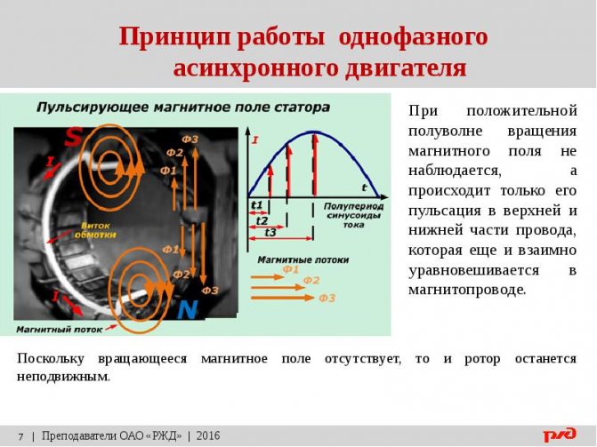 Характеристикой асинхронного двигателя является «вентиляторная», то есть агрегат поддерживает частоту вращения, приближенную к номинальной, увеличивая момент максимально резко при незначительном снижении оборотов. Если речь идет о значительном изменении этого показателя, то момент двигателя не только не растет, но и падает до нулевой отметки, что приводит к полной остановке. Обороты холостого хода немного превышают номинальные, при этом остаются постоянными. Характеристикой однофазного асинхронного двигателя является дополнительный набор проблем, сопряженных с запуском, так как он не развивает пускового момента в нормальных условиях. Магнитное поле однофазного статора, пульсирующее во времени, распадается на два поля с противоположными фазами, из-за чего пуск без всевозможных ухищрений становится невозможным: