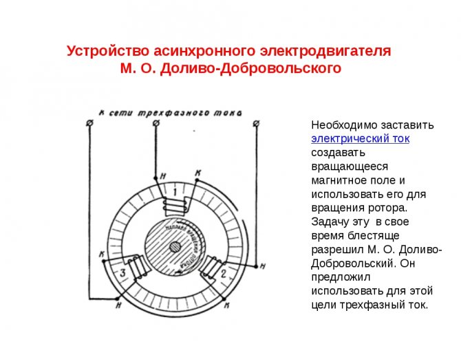 Главным отличием разработки Доливо-Добровольского от разработок Теслы было использование трёхфазной, а не двухфазной конструкции статора. Демонстрация первых двигателей состоялась на Международной электротехнической выставке во Франкфурте на Майне в сентябре 1891 года. Там представили три трёхфазных асинхронных электродвигателя, самый мощный из которых был на 1.5 кВт. Конструкция этих машин оказалась настолько удачно, что не пережила весомых изменений до наших дней.