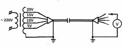 Как видно из рисунка, первичная обмотка такого трансформатора подключена к сети питания, один конец вторичной обмотки подсоединен к защитному экрану кабеля, остальные выводы — к его жилам. Для маркировки проводов необходимо замерить напряжение между экраном и каждым проводом.