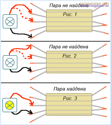 б) Если в кабеле все жилы одинакового цвета, то поступают также как и в первом случае. Две нужные жилы соединяют между собой с одной стороны кабеля, а с другой стороны кабеля производят поиск. Черным щупом прозвонки «садятся» на любую свободную жилу, а красным щупом поочередно касаются оставшихся жил (рис. 1). Если при касании к одной из жил лампочка загорелась, то пара найдена, если же лампа не загорелась, то черным щупом подключаются к следующей свободной жиле, а красным опять касаются оставшихся жил (рис. 2). Жилу, которая не прозвонилась, отгибают в сторону, чтобы по ошибке ее не прозвонить повторно.