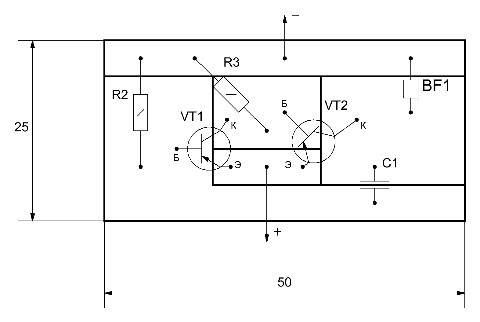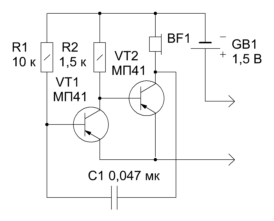 Мультивибратор собран на транзисторах МП41А, но подойдут любые другие маломощные низкочастотные p-n-p транзисторы (например, МП25, МП26, МП39, МП40, МП42). Резисторы R1 и R2 типа МЛТ-0,25. Конденсатор C1 любого типа (например, К73-17 или К10-17Б), его емкость не критична и должна составлять примерно 0,033 – 0,047 мкФ. В качестве звукового излучателя использован пьезокерамический излучатель, снятый со старого устройства. Устройство собрано на псевдо печатной плате.