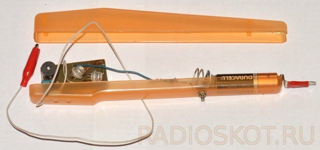 Плата звукового генератора вместе со звукоизлучателем установлена в задней наиболее широкой части корпуса. Там имеются вентиляционные отверстия, возле которых располагается звукоизлучатель. Через одно из отверстий выводится один из щупов устройства, выполненный в виде провода, длиной около 40 см с зажимок «крокодил» на конце. Следует отметить, что по опыту эксплуатации желательно удлинить провод до 1 м. Второй щуп представляет собой жестяную пластину, которая одновременно подключена к положительному полюсу элемента питания.