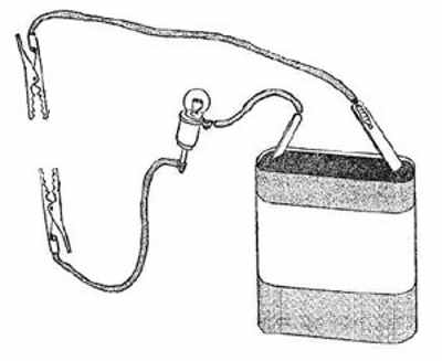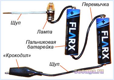Один вывод лампы припаивают, например, к положительному полюсу батарейки, ко второму выводу лампы припаивают щуп, выполненный из отрезка медного провода. К отрицательному полюсу батарейки припаивают второй щуп, состоящий из отрезка гибкого провода с насадкой типа «крокодил» на конце. Можно обойтись и без крокодильчика, но тогда в процессе прозвонки одна рука будет всегда занята, так как ей придется держать щуп и жилу кабеля.