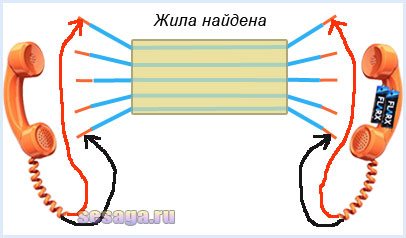 Первый касается только жилы «а» пары. Второй проверяет на «щелчок» жилу «а» и на его отсутствие жилу «б». Возвращается на жилу «а», даёт команду «дальше». Первый переключается на жилу «б». Второй проверяет его присутствие на этой жиле и по ней же даёт команду «дальше». Для следующей пары процесс повторяется.