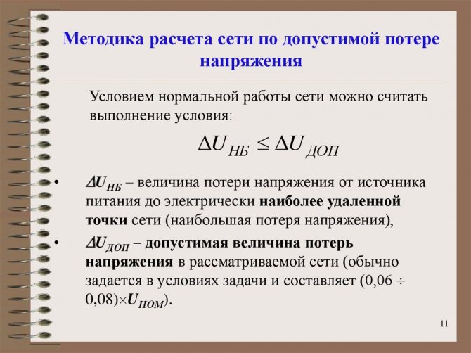 Колебания силы тока и потребляемой мощности приводит к изменению напряжения в токопроводящих жилах возле потребителя. Поэтому при составлении схемы электропроводки необходимо учитывать допустимые потери.
