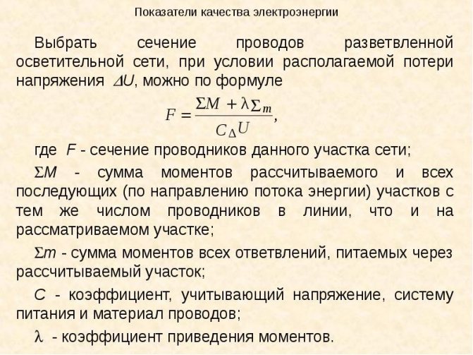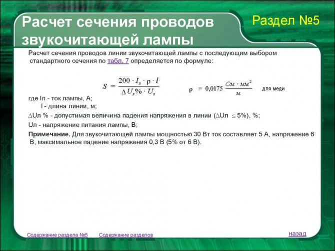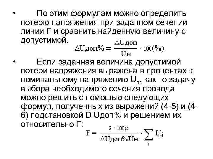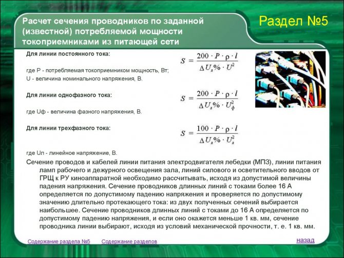 Расчет по формулам ΔU по длине кабеля