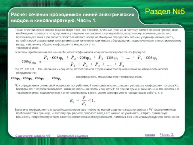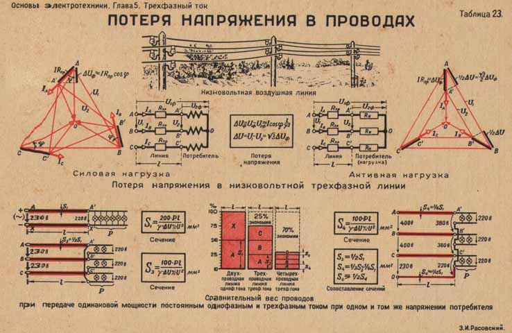 В трехфазной сети мощности на фазных проводах компенсируют друг друга, а длина нулевого проводника не учитывается, так как по нему не идет ток. Если нагрузка по фазам неравномерная, расчет выполняют как для однофазной сети. Для линий большой протяженности дополнительно учитывают емкостное и индуктивное сопротивление.