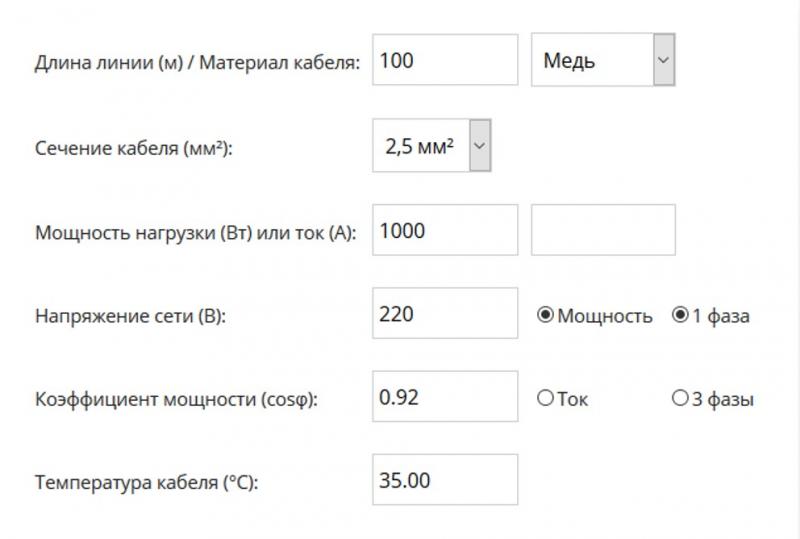 При помощи онлайн калькулятора расчет потерь напряжения в кабеле сводится к таким действиям: