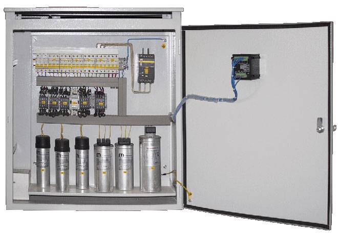 - Общая компенсация предусматривает вставку конденсаторов с регулятором в основном щите, или ГРЩ. Он производит оценку по факту текущего потребления реактивной мощности и быстро подсоединяет и отсоединяет нужное число конденсаторов. В результате берущаяся от сети общая мощность приводится к минимуму в согласии с моментальной величиной необходимой реактивной мощности.
