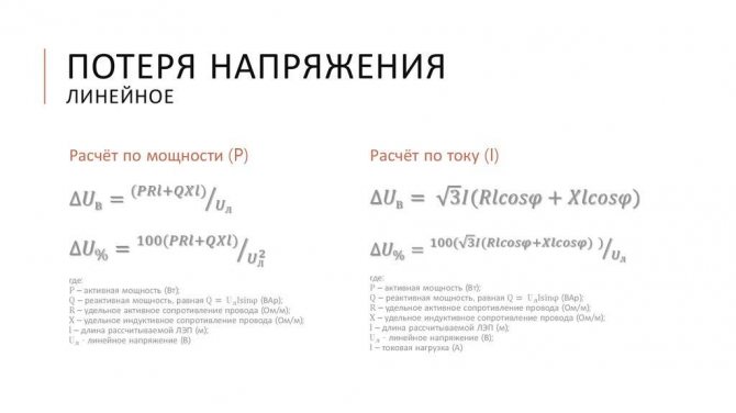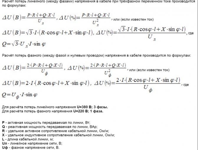 Расчёт потерь напряжения в кабеле можно осуществить по следующей формуле:
