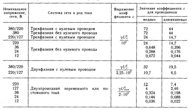 - l – длина кабельной линии (если нагрузка однофазная, а кабель имеет две жилы, то обе они включены последовательно и длину необходимо умножить на 2)