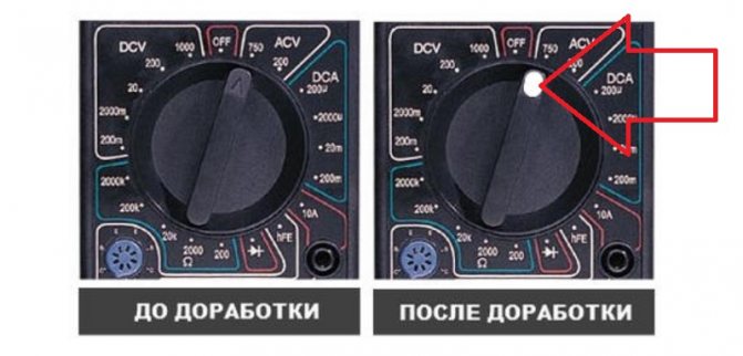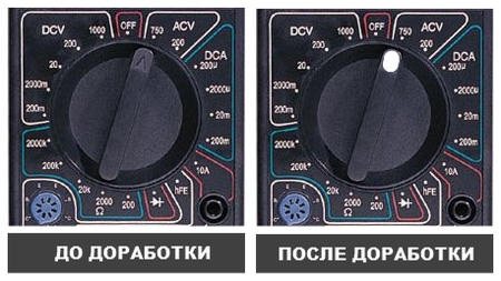 Переключение режимов происходит при помощи центрального поворотного переключателя. В самом начале использования цифрового мультиметра рекомендуется сразу же отметить метку указателя на переключателе контрастной краской. Например вот так: