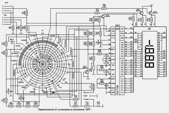 Резисторы и другие дополнительные компоненты необходимы для шагового изменения тока и напряжения. Поворотным регулятором переключают электрическую цепь в нужный диапазон измерений. Питание – автономное от сменной батареи типа «Крона» (9V).