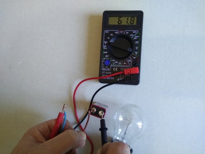 Для замера постоянного тока мы воспользовались той же батарейкой Крона и 100-ватной лампочкой, соединив их в одну цепь. Показатели были следующими: