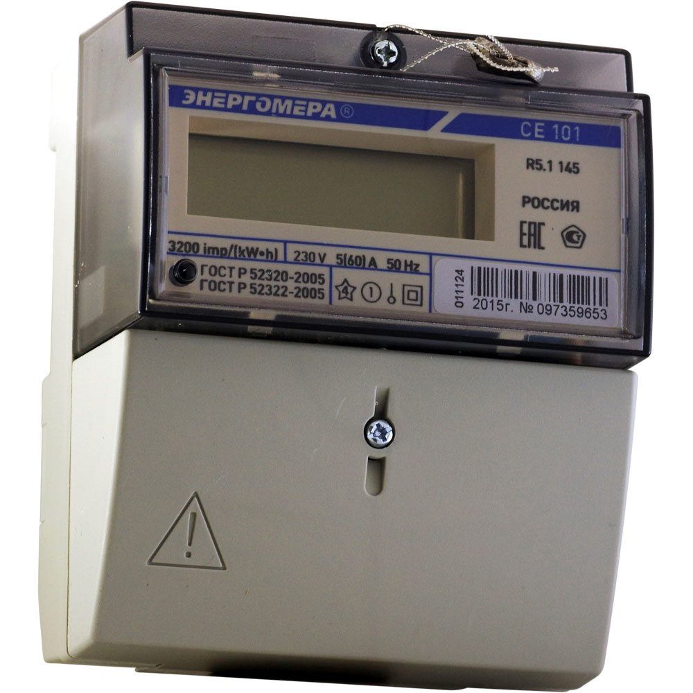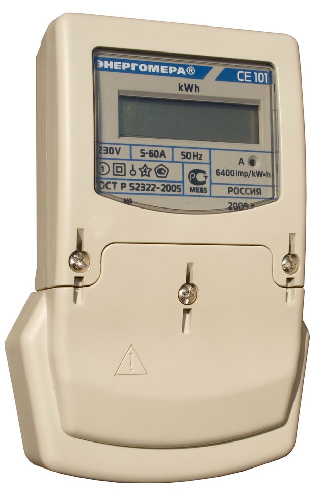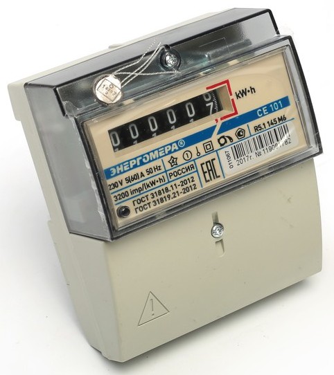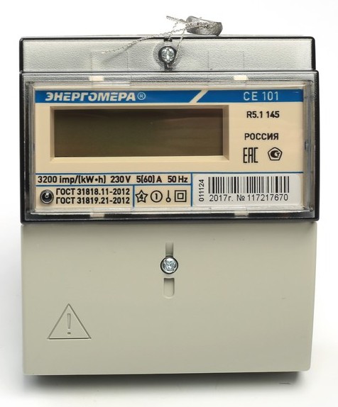 Модификация электросчетчика СЕ 101-R5. Однофазный прибор учета электрической энергии, работающий по однотарифному принципу. Устройство монтируется на стандартную DIN-рейку. Прибор используется для постоянного измерения и отображения на табло активной составляющей мощности потребленной электроэнергии. Подключается счетчик к двухпроводным линиям подачи переменного напряжения. В качестве измерительного элемента в устройстве используется датчик тока в виде специального шунта. На следующем рисунке представлена модификация электросчетчика СЕ 101-R5 с жидкокристаллическим дисплеем.