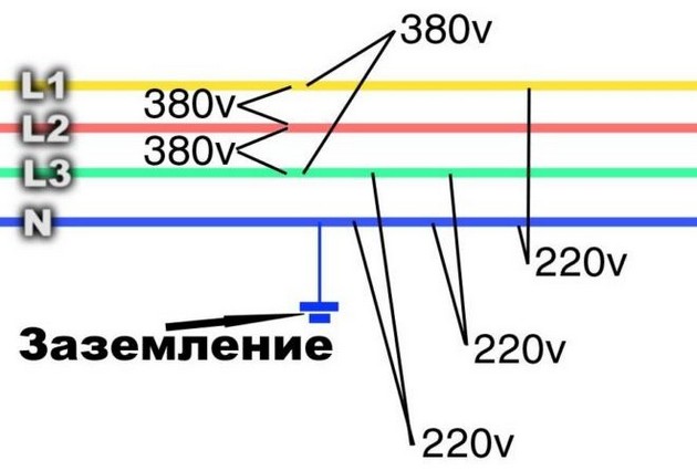 Электроэнергия подается к потребительским розеткам от подстанций, которые уменьшают поступающее напряжение до 380 В. Вторичная обмотка такого трансформатора имеет соединение «звезда» — три его контакта связываются между собой в точке «0», остальные три вывода идут к клеммам «А»/«В»/«С».