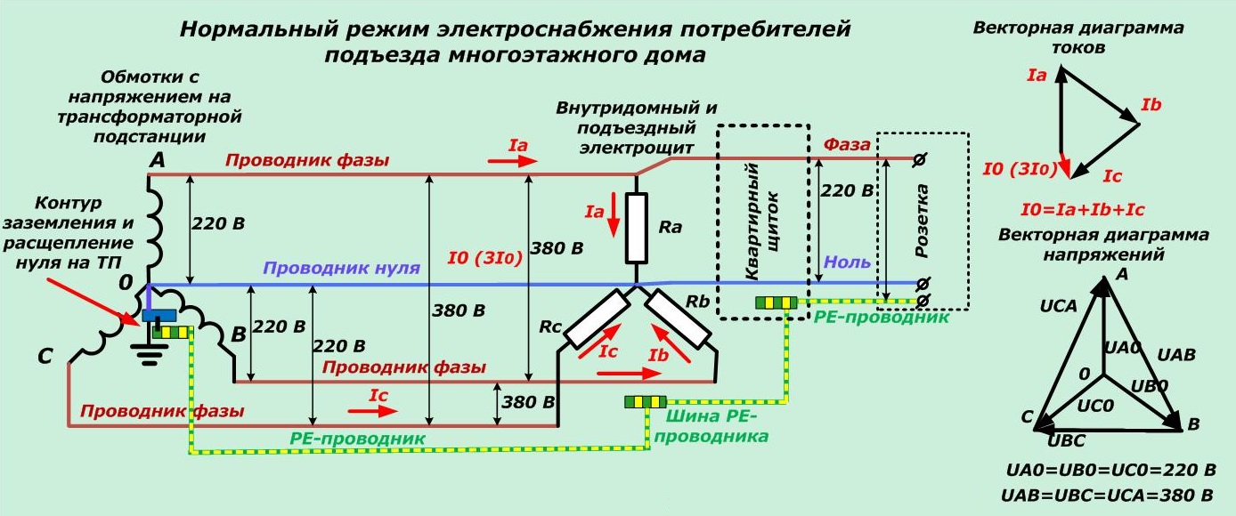 Схема подводимого напряжения представляет собой «звезду», которая в точности повторяет все векторные характеристики питающей подстанции. Когда в розетках нет никаких потребителей, то ток в данной цепи не протекает.