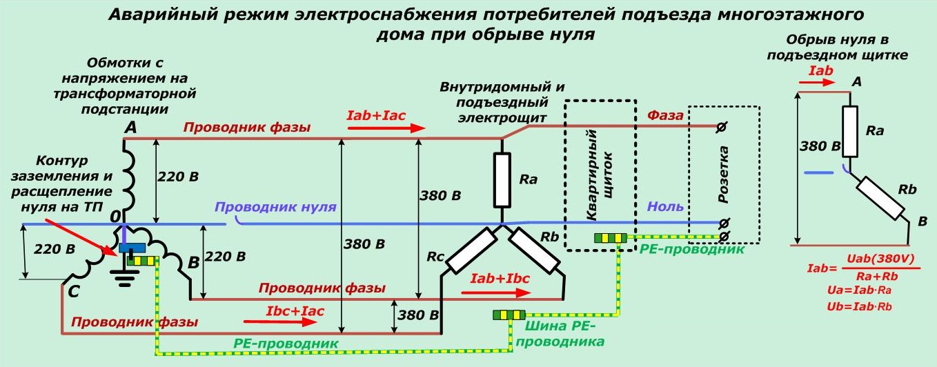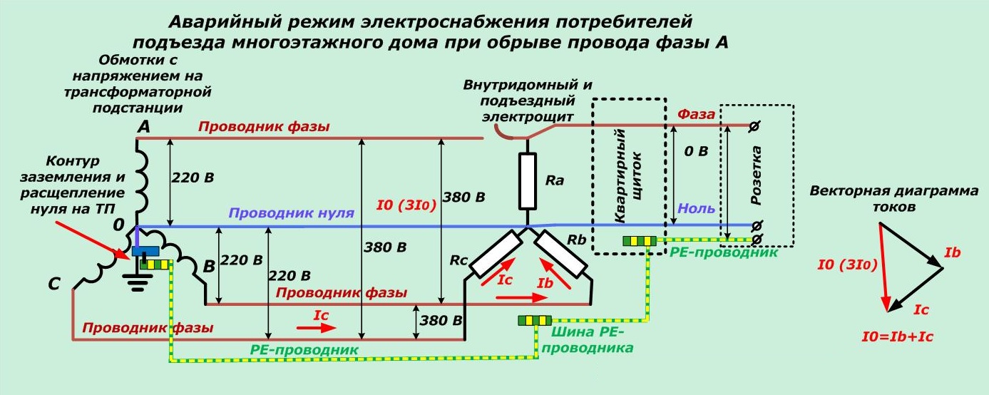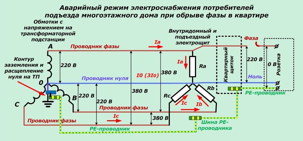 Из этих схем видно, что полное отключение питания в квартирах связано с обрывом одного их проводов. Это не приводят к повреждению и выходу из строя приборов.