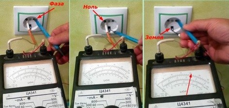 Так, в первом случае вольтметр отклоняется от нулевой отметки в цепи «ноль/фаза». На другом рисунке он показывает отсутствие напряжения между нулем и землей. И на третьем, вольтметр между фазой и землей показывает «0 В» поскольку проводник еще не подсоединен к земле. Третий случай — это скорее исключение из правил. Такое возможно, например, в случаях, когда старые кабеля здания находится на этапе реконструкции. В нормальной работающей системе электропроводки вольтметр тоже должен показывать 220 В.