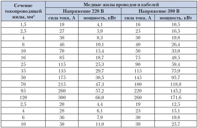 Допустимый ток для медных проводов зависит от суммарной мощности потребителей и напряжения электрической цепи. Вычисляется по формуле: I= P/V и составляет 10А на 1 мм2.