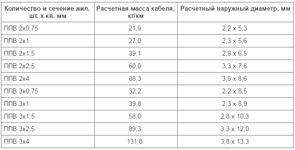 Пример маркировки: ППВ 2х4-380 — провод плоский, двухжильный, сечение жилы 4 мм2, напряжение сети 380 Вольт.