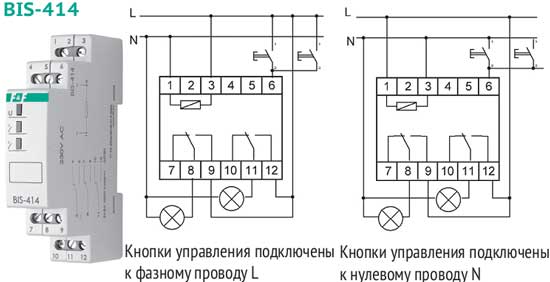 импульсное электромагнитное реле бистабильного типа 411, способно передавать до 12в. Кнопки этого прибора параллельно соединены между собой, при этом, когда замыкаются контакты в одном месте, электрическая схема автоматически размыкает их в другом. Переключать можно любым удобным способом. Главным преимуществом является экономия кабеля, нет необходимости разветвлять проводку в квартире; Импульсное реле bis-414