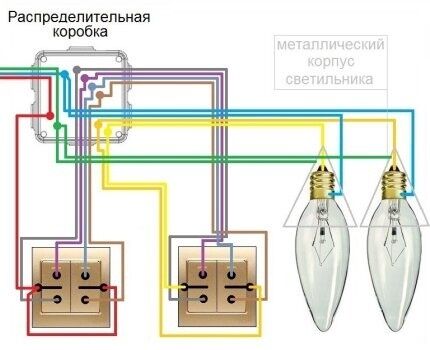 Схема наглядно показывает перегруженность проводами: от первого выключателя – пять, от второго – шесть, от первой и второй подсветки – по три кабеля