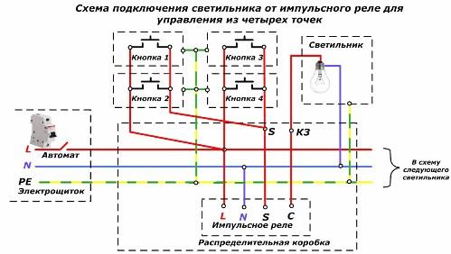 Импульсное реле очень часто используется с подключением нескольких выключателей с пружинным возвратом кнопки. Подключаться они должны параллельно друг к другу по всем требованиям.