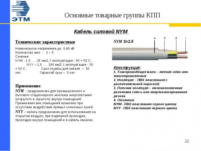 Бывает одножильным и многожильным. При этом жила однопроволочная до сечения 25мм2. Чаще всего имеет плоскую форму, что бывает очень удобным, при закладывании его в узкую штробу в вертикальном положении.