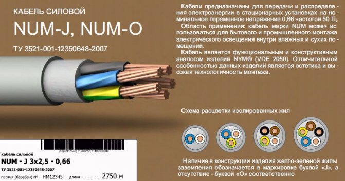 - NUM-J – это провод, как минимум, с тремя жилами, где один из них обязательно жила заземления, раскрашенная в желто-зеленый цвет.