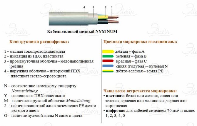 Производящийся в России или импортируемый из Европы кабель NYM, если это не подделка, всегда имеет цветовую маркировку изоляции проводников, соответствующую нормам российских ПУЭ (Правил устройства электроустановок).