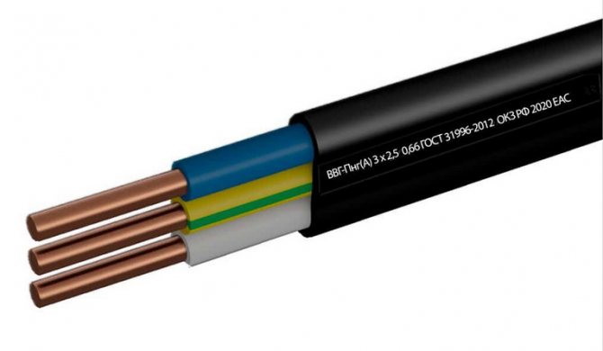 Первый самый распространенный и наиболее правильный вариант кабеля – это ВВГнг и его разновидность ВВГнг-LS. Кабель из себя представляет следующую конструкцию: