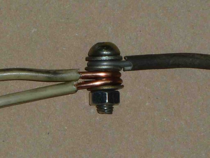 Достаточно распространённым способом соединения является болтовое соединение. Для этого вида необходимы болт, не меньше двух шайб и гайка. Диаметр болта зависит от толщины провода. Он должен быть таким, чтобы из провода можно было сделать кольцо. Если соединяются провода разного сечения, то болт выбирается по наибольшему.