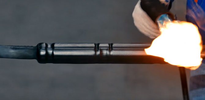 После срыва, термоусаживаемый чехол надвигают на затянутый зажим и с помощью газовой горелки разогревают трубку, постепенно смещая зону разогрева от середины к краям.