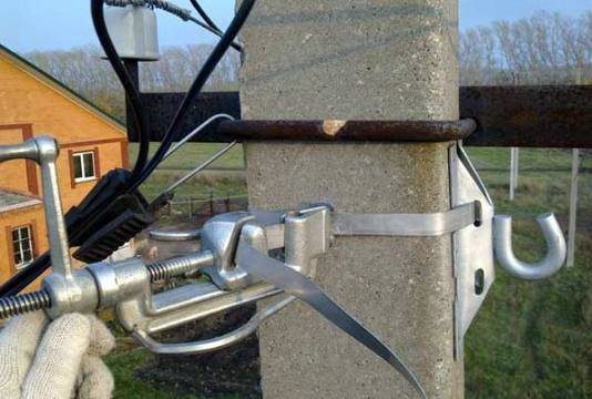 - После подъема на последнюю опору, трос-лидер соединяется с СИП посредством специального чулка и вертлюга, препятствующего закручиванию провода в процессе раскатки.
