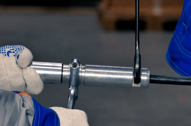 После этого вставляют до упора в цанговый зажим и с помощью двух стандартных рожковых гаечных ключей затягивают соответствующую гайку-колпачок. Затяжка происходит до момента отрыва цанг внутри зажима.