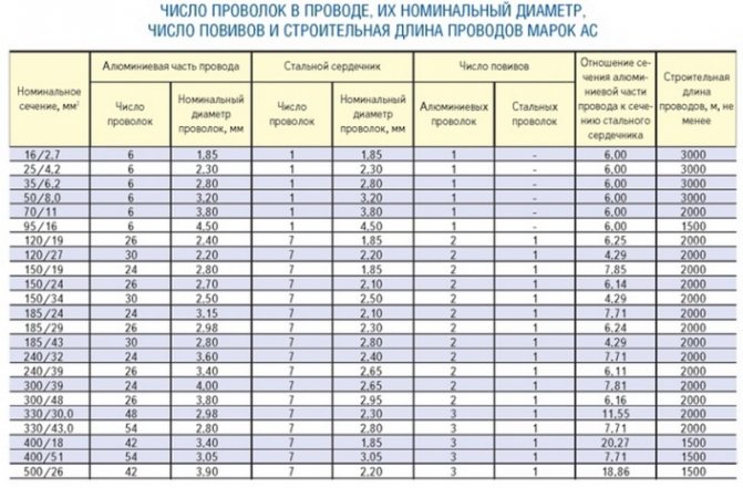Остальные свойства определяются исходя из сечения и длины провода. Электрические параметры некоторых кабелей марки АС приведены в таблице.