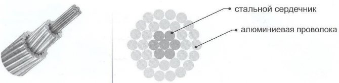 Устройство провода АС напоминает обычный тряпичный канат, но завитый из двух материалов. В середине имеется стальной трос. Он изготовлен из одной или нескольких тонких проволок. Задача стального троса — придать проводнику прочность, гибкость и устойчивость к растяжению. Он выполняет механическую, несущую функцию.
