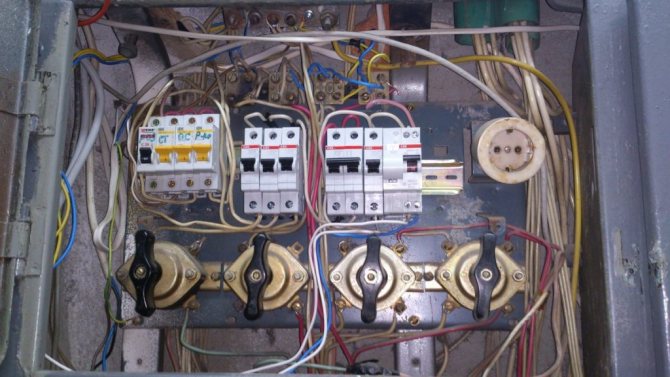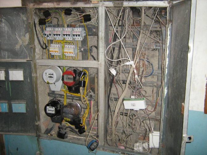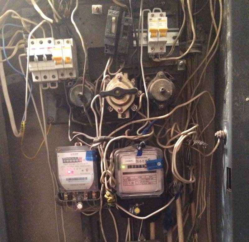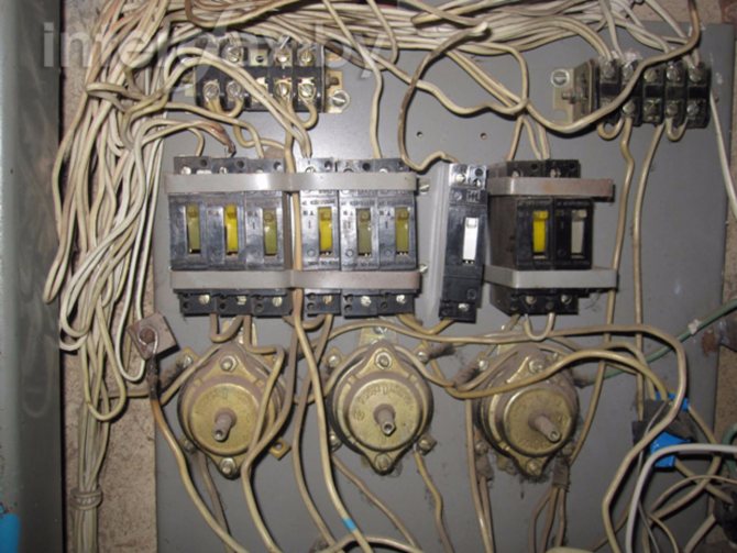 Если ваш подъездный щиток выглядит именно так — вопрос: «как отключить свет в квартире?» решается переводом нужного автомата в режим «выкл». К сожалению, на практике многие подъездные щитки выглядят так: