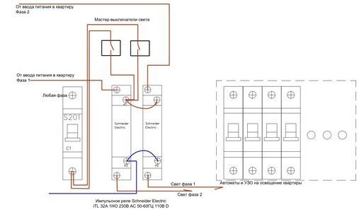 · Управление функцией из нескольких мест – благодаря использованию импульсного реле, способного выполнять команды, полученные из разных источников, Вы можете выключить свет во всем доме из прихожей, и, например, своей спальни. Кстати, применение импульсных реле с 2-мя группами контактов позволяет установить в доме любое количество мастер-выключателей для отключения света во всем жилище (при желании, даже в каждой комнате).