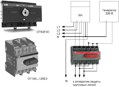 - Для ручного перевода фазы подойдет переходной рубильник, работающий в двух направлениях.