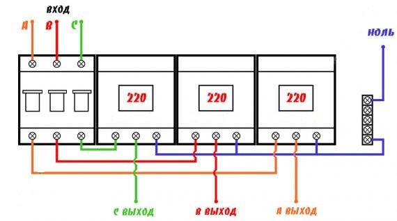 Можно установить отдельные входные автоматы, чтобы в случае необходимости обесточить нужное реле, если вдруг придется его отключать. Как видим, монтаж ничем не отличается от рассмотренных примеров выше, только вместо одного блока — сразу три, каждый на свою фазу.
