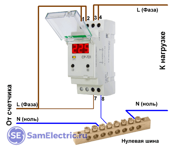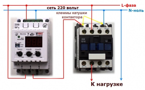 Реле контроля сетевого напряжения – это отличная защита от «обрыва нуля» и резких перепадов вольтажа. Подключить его несложно. Надо лишь вставить соответствующие провода в клеммы и затянуть их. Практически во всех случаях применяется стандартная схема с прямой нагрузкой через РКН.