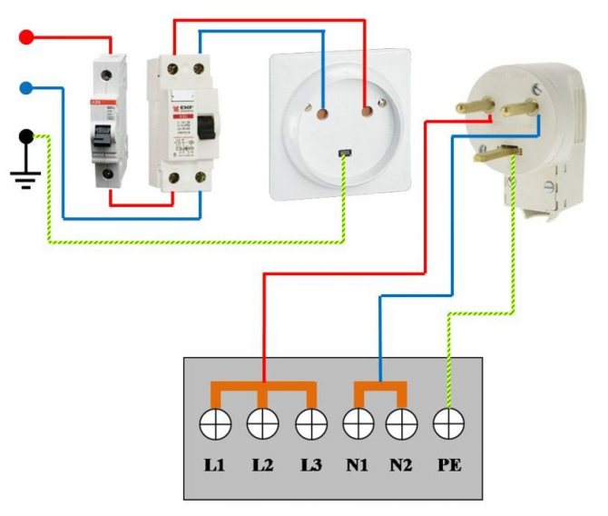 У некоторых устройств нет контактов, а вместо них просто выведен провод, который надо подключать к штепселю. Независимо от количества фаз цвета изоляции заземляющего провода будут желто-зелеными, нулевой – синий, а фазные – любых других.