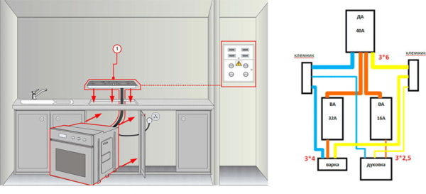 Это означает, что получится обойтись без розеток и вилок. Кроме этого, акцент делается на мощности оборудования, исходя из чего производится выбор фурнитуры, провода, автоматического выключателя номиналом 32А и УЗО номиналом 40А.