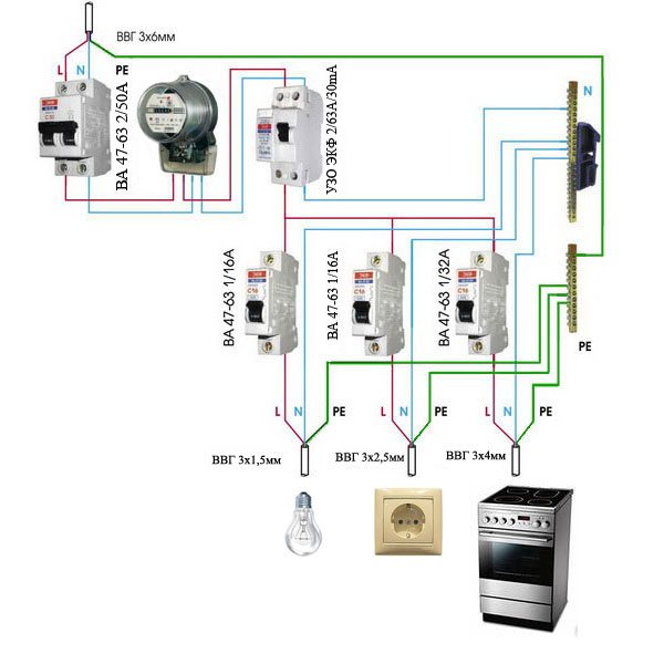 Желательно выполнить подключение так, чтобы цепь освещения и силовые (розеточные) цепи были разъединены. Но, возможно подключение смешанного питания. Линии же, идущие на силовые установки (плиту, духовой шкаф, автоматическую стиральную машинку) подключаются раздельно.