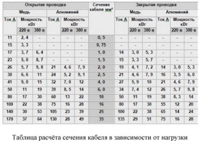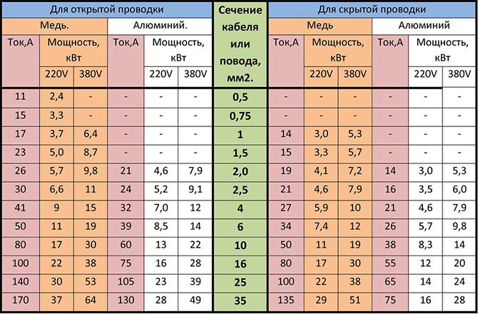 Получаем ток данной цепи 10 Ампер. По таблице смотрим сечение кабеля. Оно равно 2,5 мм 2 , для меди. Алюминиевый кабель в рассмотрение не берем.